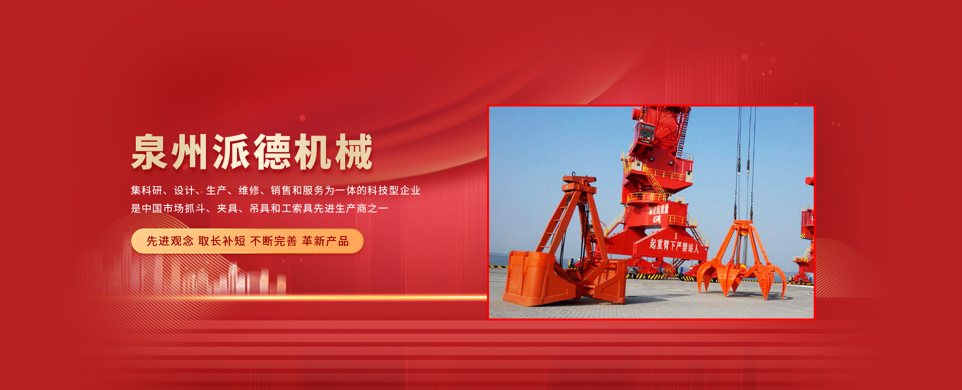 泉州派德機(jī)械有限公司成立于2012年5月,位于全國文明的古城福建泉州,公司擁有各類型專業(yè)員工82人,其中高級(jí)工程師1人,工程師4人,助理工程師5人,是一家集科研、設(shè)計(jì)、生產(chǎn)、維修、銷售和服務(wù)為一體的科技型企業(yè),是中國市場(chǎng)抓斗、夾具、吊具和工索具先進(jìn)生產(chǎn)商之一。產(chǎn)品采用國內(nèi)外先進(jìn)的設(shè)計(jì)方案、技術(shù)規(guī)范、制造過程、工藝流程和服務(wù),憑借在抓斗、夾具、吊具和工索具領(lǐng)域的超前設(shè)計(jì)理念和成熟的技術(shù)、工藝和管理,在抓具領(lǐng)域迅速崛起。